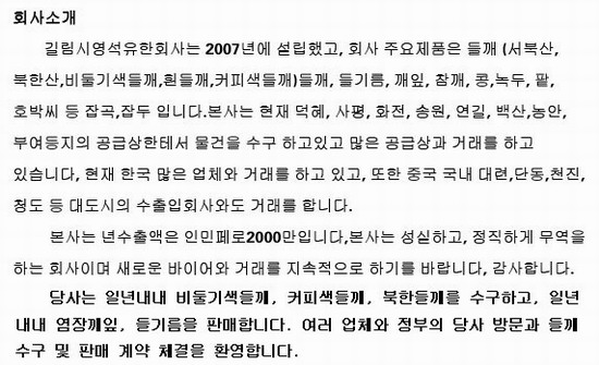 吉林市一洋工贸有限公司成立于2007年,公司主营项目:苏籽(西北、深灰、白苏籽、咖啡色)、苏子,苏子油,苏籽油、苏子叶、芝麻、黄豆、绿豆、红豆、白瓜子等杂粮、杂豆。目前公司与黑龙江省、吉林省、辽宁省、甘肃省、山西省等地的农业经纪人及地方常年合作收购农产品,有着广阔的农产品收购渠道。目前公司已与韩国多家公司常年签订供销合同,同时与国内大连、丹东、天津、青岛等各大城市多家进出口公司签署常年供销合同。